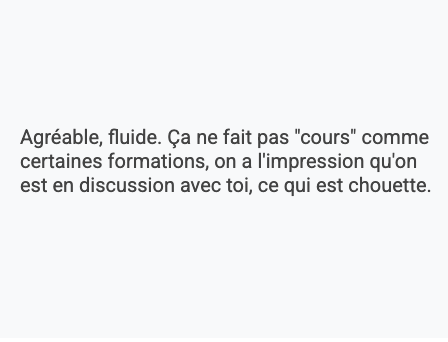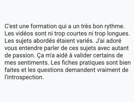 La formation est conçue pour être suivie de façon autonome, quand tu veux, où tu veux. Mais tu ne seras pas seule : une "hotline" est disponible pour poser tes questions, partager un blocage, ou demander un éclairage sur un module.
